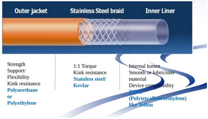 نعومة ونعومة القناة: يمكن لمواد التبطين مثل PTFE، وPA12، وPEBAX أن توفر سطحًا داخليًا أملسًا، وتقلل الاحتكاك والضرر، وتضمن قنوات سلسة.